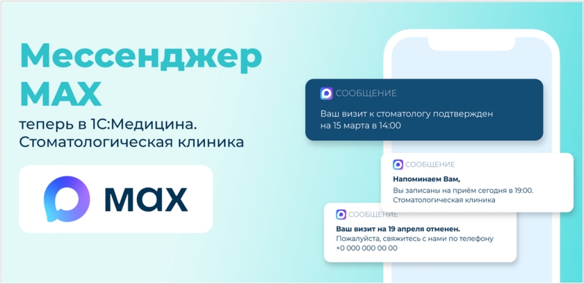 В программе 1С:Медицина. Стоматологическая клиника стала доступна интеграция с мессенджером MAX. Интеграция дает возможность отвечать и писать пациенту первыми прямо из его карточки в программе; контролировать работу сотрудников, обмениваться фотографиями, видео и документами без пересылок в сторонние сервисы. Вся переписка автоматически сохраняется в 1С:Медицина. Стоматологическая клиника, что исключает потерю сообщений и истории общения с пациентом. Также, в программе появился график работы по кабинетам - теперь в расписании можно сразу указать связку врач + ассистент + кабинет. При фильтре «Кабинеты» отображаются все врачи, работающие в выбранном кабинете. Появились новые отчёты для анализа выручки и возврата пациентов. В мобильном приложении теперь можно просматривать снимки пациентов.