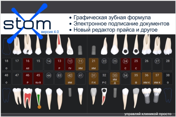StomX представил обновленную версию своей программы для стоматологий, в которой реализовали многочисленные улучшения и нововведения на основе ваших пожеланий. В новую версию вошло: графическая зубная формула, поддержка мессенджера Max, новый редактор прайса, интеграция с сервисом N3.Health СЭП, интеграция с сервисом N3.Health Mila, доработка интеграции с Продокторов - возможность записаться на услугу и многое другое