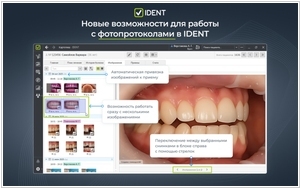 Теперь все действия с изображениями в IDENT выполняются одинаково вне зависимости от раздела — в карточке пациента или при заполнении истории болезни. Новые возможности делают работу с фотопротоколами понятной и помогают врачу быстрее выполнять задачи, уделяя больше времени пациентам. Улучшено добавление сразу нескольких изображений. Врач сразу увидит, к какому приему они прикрепились, сможет указать зубы и название. Изменить тип изображения стало проще - через контекстное меню. Главный врач при проверке историй болезни сможет подвинуть границу области с изображениями как удобно. Например, сначала оценить весь набор фотографий с приема, с отметками зубов и названиями, а потом увеличить и рассмотреть конкретное фото для проверки качества лечения.