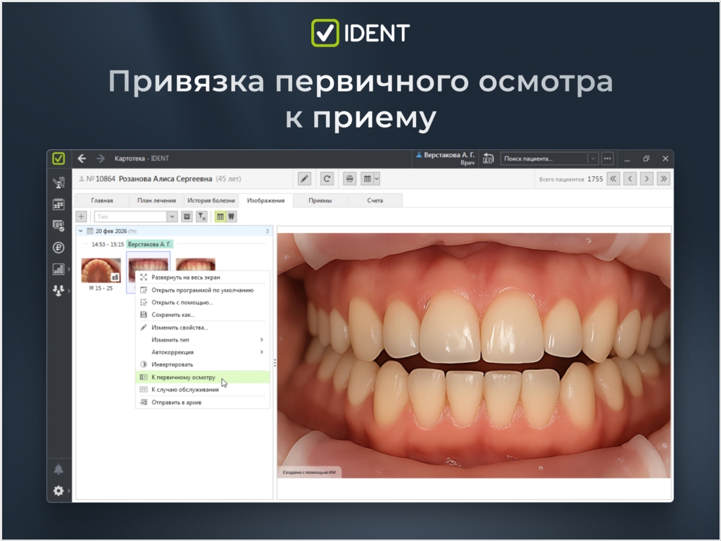 Новый функционал IDENT позволяет связывать первичный осмотр с конкретным визитом, давая врачу доступ ко всем фотографиям приема при заполнении документа. Это помогает точно зафиксировать клиническую ситуацию и наглядно обосновать план лечения, опираясь на актуальные снимки. Прямая связь осмотра с приемом делает документацию прозрачной и упрощает контроль качества. Главный врач может мгновенно перейти от снимков к диагнозу, чтобы проверить обоснованность назначений. Система фиксирует обстоятельства получения данных, что исключает путаницу в истории болезни. Это повышает стандарты диагностики и минимизирует риски клиники за счет автоматического сопоставления фотопротокола и медицинских заключений.
